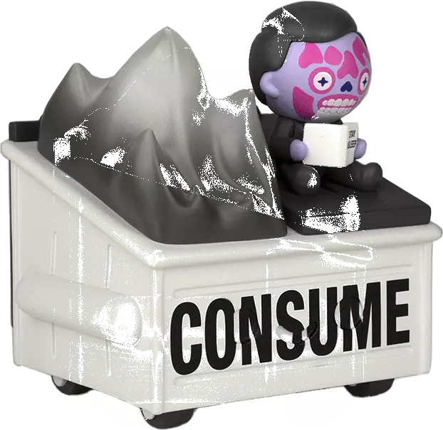 Inspired by one of our favorites films, THEY LIVE, we have teamed up with the awesome folks at 100% Soft and put a new (horrific) spin on their super popular Dumpster Fire Soft Vinyl toy. This one is ready to CONSUME, and is available during SDCC 2022.Â