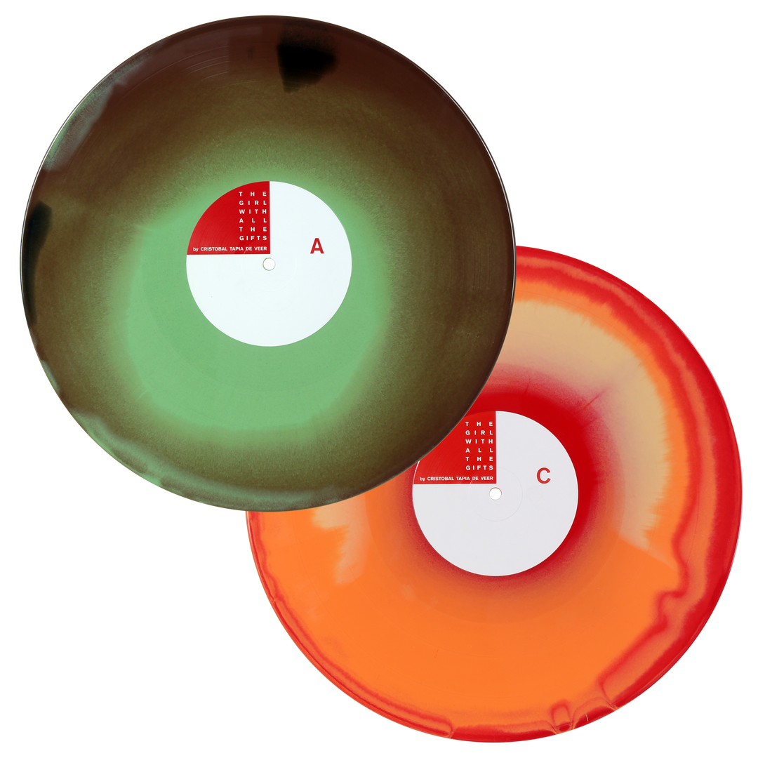 Die cut outer sleeve (with flood printing) housing a spot varnish 425gsm gatefold jacket containing 2x 180 Gram Vinyl (Disc 1 Green & Brown Swirl. Disc 2 Red and Orange Swirl)