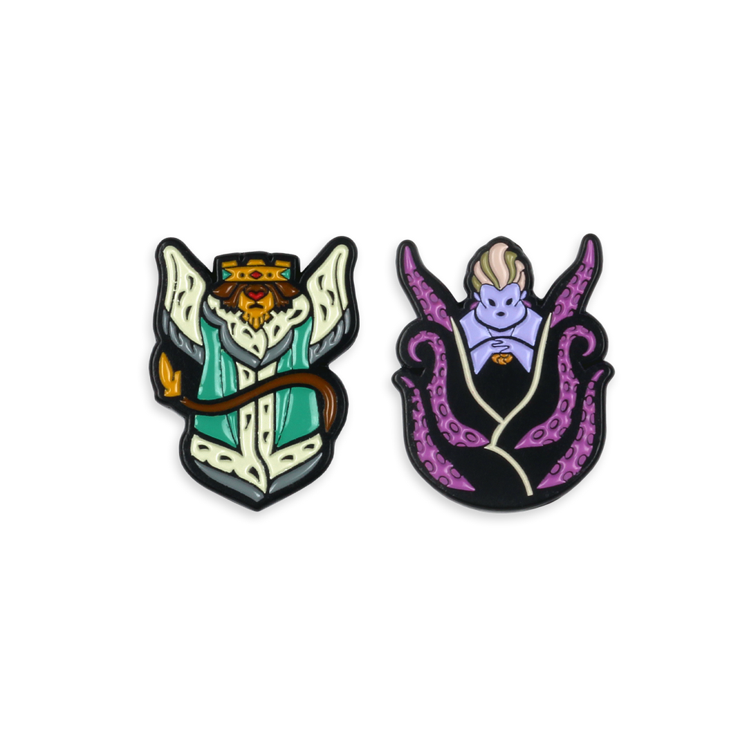 Our second series of Disney Villains enamel pins designed by the talented artist Dave Quiggle, featuring the phony king of England β Prince John of ROBIN HOOD, alongside the devious witch of the sea β Ursula of THE LITTLE MERMAID. Dave’s illustrative style carries the hand of a tattoo artist β thick bold outlines and saturated colors are the hallmark of this growing collection of neβer-do-wells.