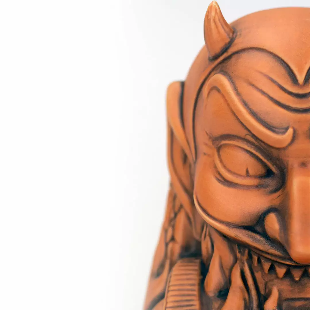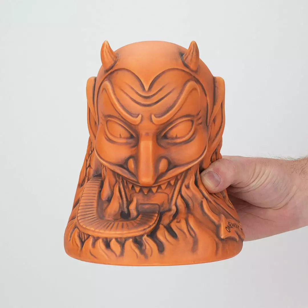 From artist Doug P’Gosh and sculptor Tufan Sezer, Ol’ Scratch comes knocking down your door to take you to Tiki Hell. Fit for a carnival, this punch bowl-sized terror stands at approx. 7.25” tall and holds 32 oz.