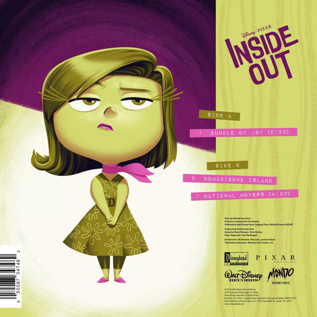 Mondo in collaboration with Walt Disney Records is proud to present the Inside Out 7-Inch Single series. Each featuring Michael Giacchino’s theme from Disney•Pixar’s Inside Out “Bundle Of Joy” and a exclusive B-Side. Featuring artwork by Phantom City Creative, inspired by classic album covers.