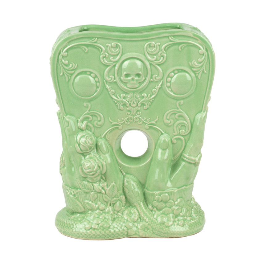A blood-chillingly beautiful mix of ouija occultism and delicate Victorian darkness, Death’s Whisper fits just as well in your home bar as it does in your eternal resting place. It’s 8″ of smoothly sculpted stoneware ceramic available in this gorgeous gothic glazeway Seance by the Sea.